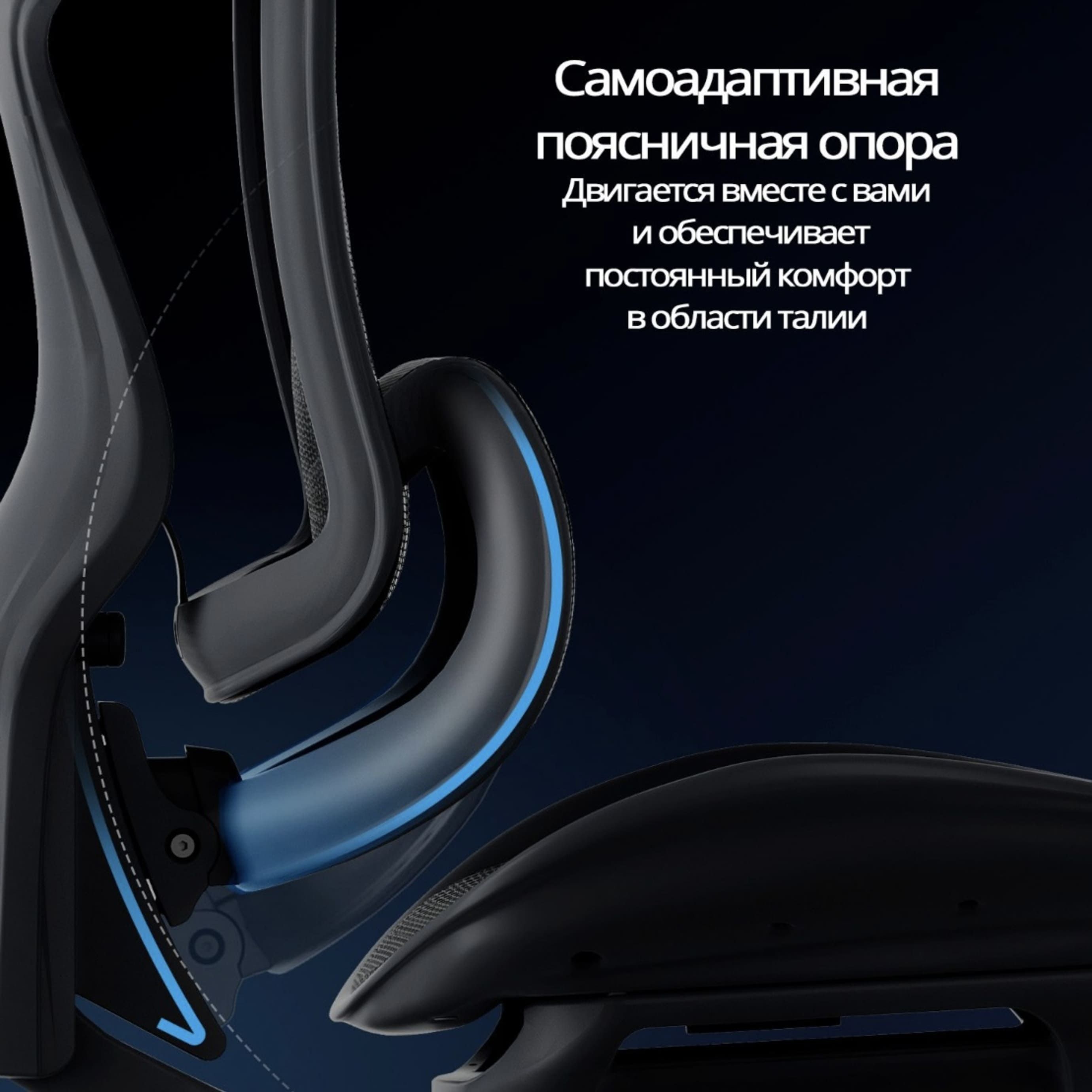 - адаптивная поясничная поддержка регулируется по высоте вместе со спинкой, что позволяет пользователю настроить кресло под свой рост;